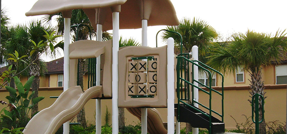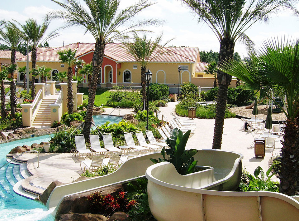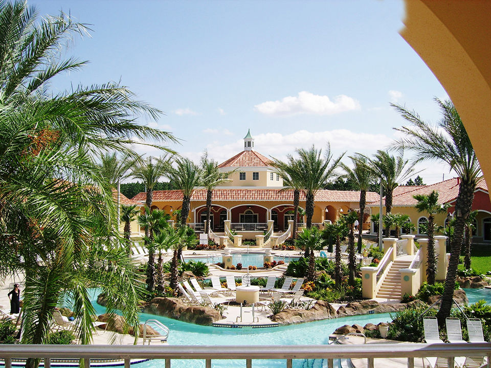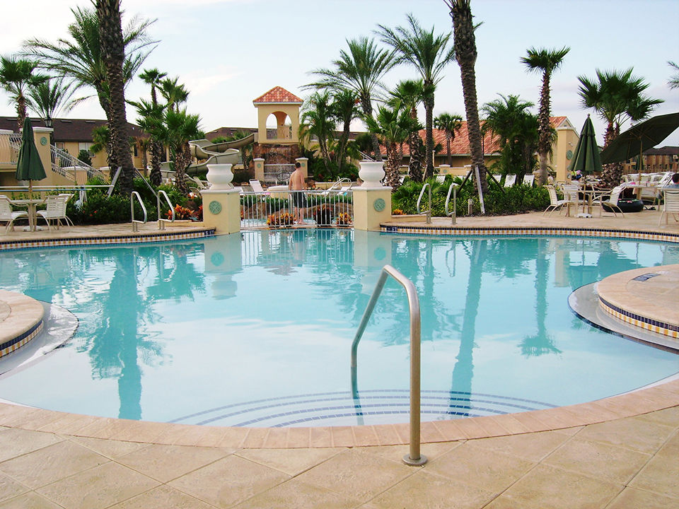 The Regal Palms Resort complex includes 2 heated pools, a water slide, a spa, a lazy river, and tikki bar. The clubhouse features a games room, internet connection, a sports bar and a restaurant with inside and outside dining areas. This outside dining area over looks the large pool complex.